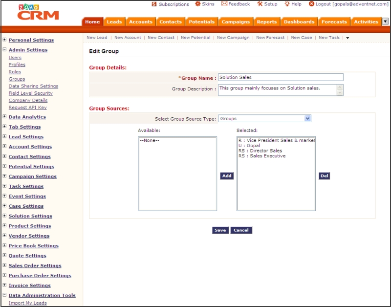 Groups (also called as Teams) allow you to extend the data-level access to other users with similar job profile, working in the same department or project, or sharing the data among common geographical location.