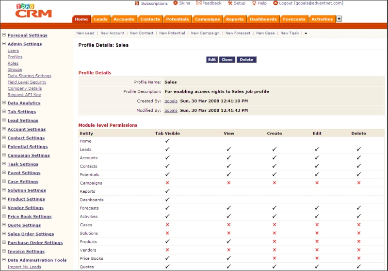 Using profiles, you can define fine-grained access rights to the CRM modules, data administration tools, CRM records, and fields within each module.